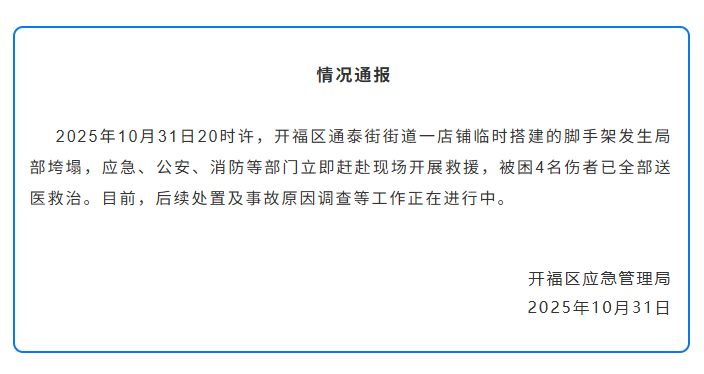 長沙市開福區(qū)應(yīng)急管理局通報,2025年10月31日20時許,開福區(qū)通泰街街道一店鋪臨時搭建的腳手架發(fā)生局部垮塌,應(yīng)急、公安、消防等部門立即趕赴現(xiàn)場開展救援,被困4名傷者已全部送醫(yī)救治。目前,后續(xù)處置及事故原因調(diào)查等工作正在進行中。(申智林)