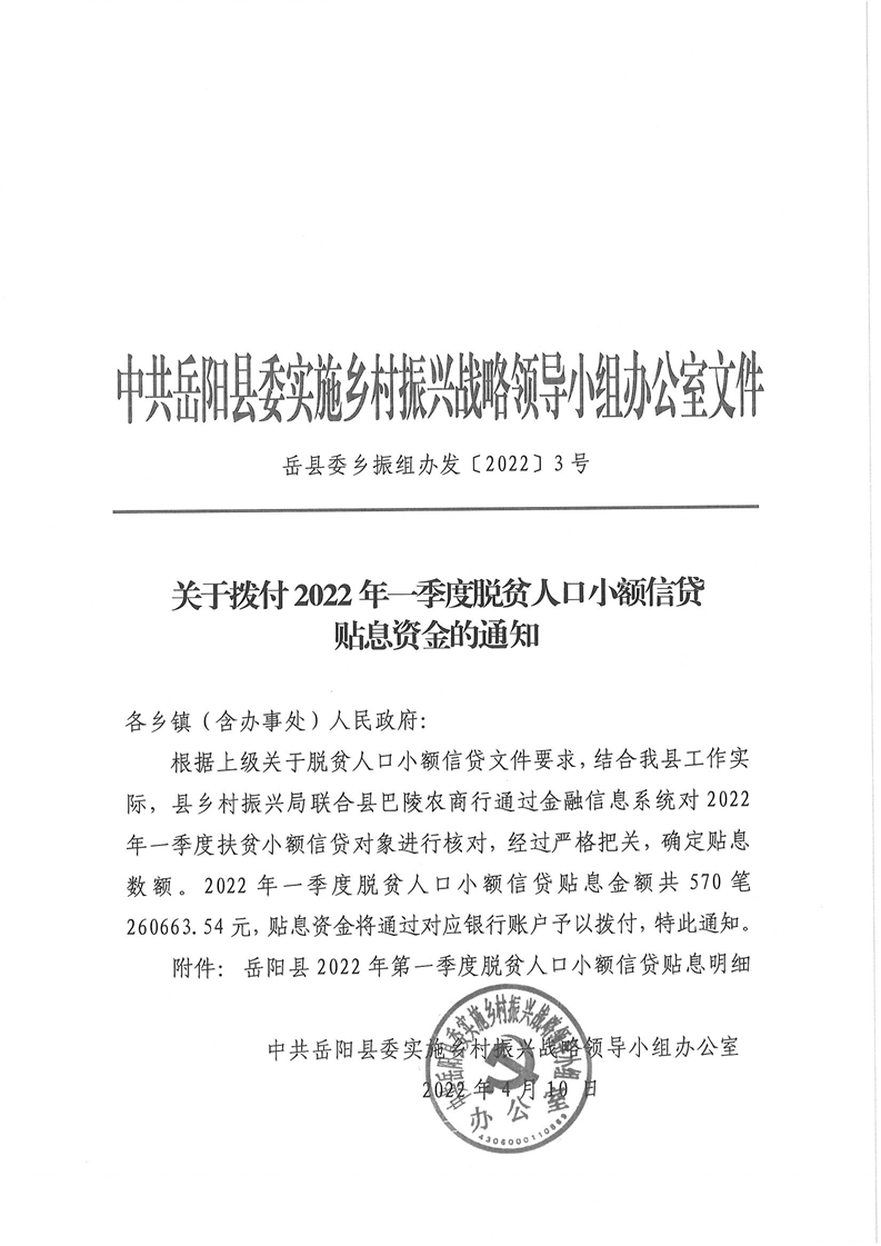 岳陽(yáng)縣財(cái)政局下達(dá)2022年一季度脫貧人口小額信貸貼息資金及績(jī)效目標(biāo)批復(fù)的公開(kāi)公示