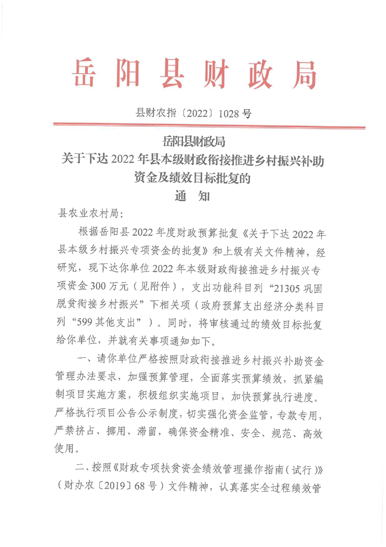 岳陽(yáng)縣財(cái)政局關(guān)于下達(dá)2022年縣本級(jí)財(cái)政銜接推進(jìn)鄉(xiāng)村振興補(bǔ)助資金及績(jī)效目標(biāo)批復(fù)(農(nóng)業(yè)局300)公開公示