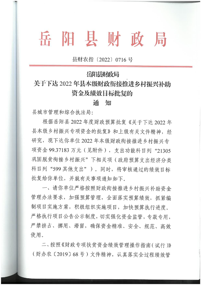 岳陽縣財政局關(guān)于下達(dá)2022年縣本級財政銜接推進鄉(xiāng)村振興補助資金及績效目標(biāo)批復(fù)(城管局99.37)公開公示