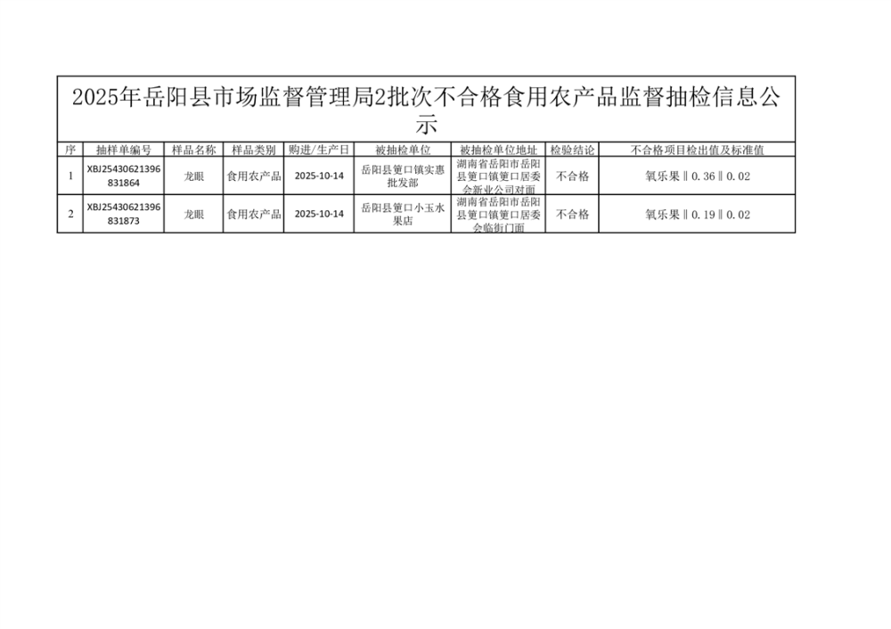 2025年11月24日抽檢數(shù)據(jù)公示(不合格2批次-華中)
