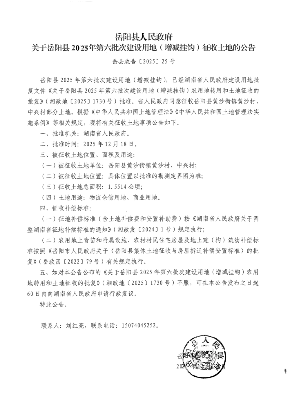 岳陽縣人民政府關于岳陽縣2025年第六批次建設用地(增減掛鉤)征收士地的公告(岳縣政告[2025]25號)