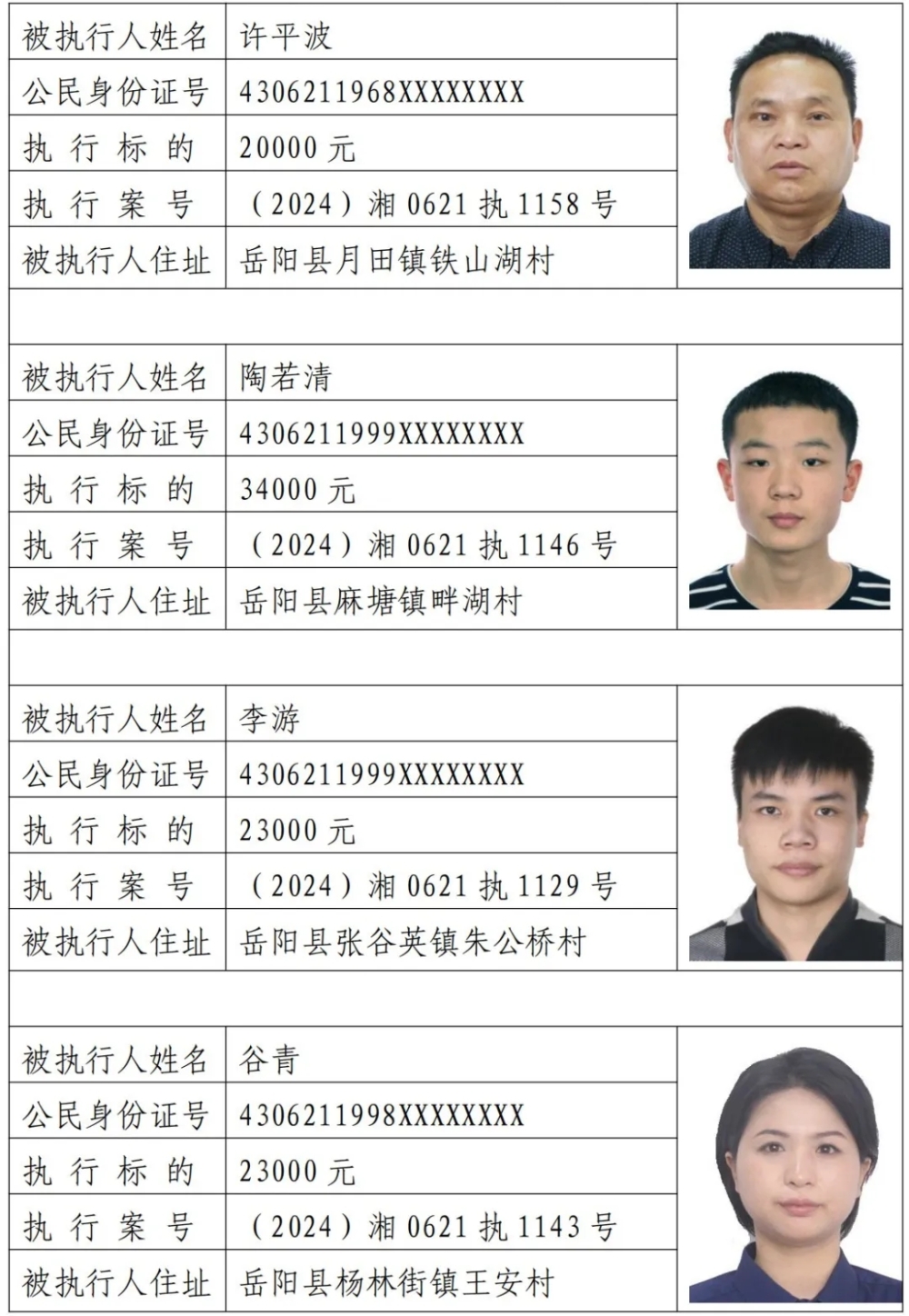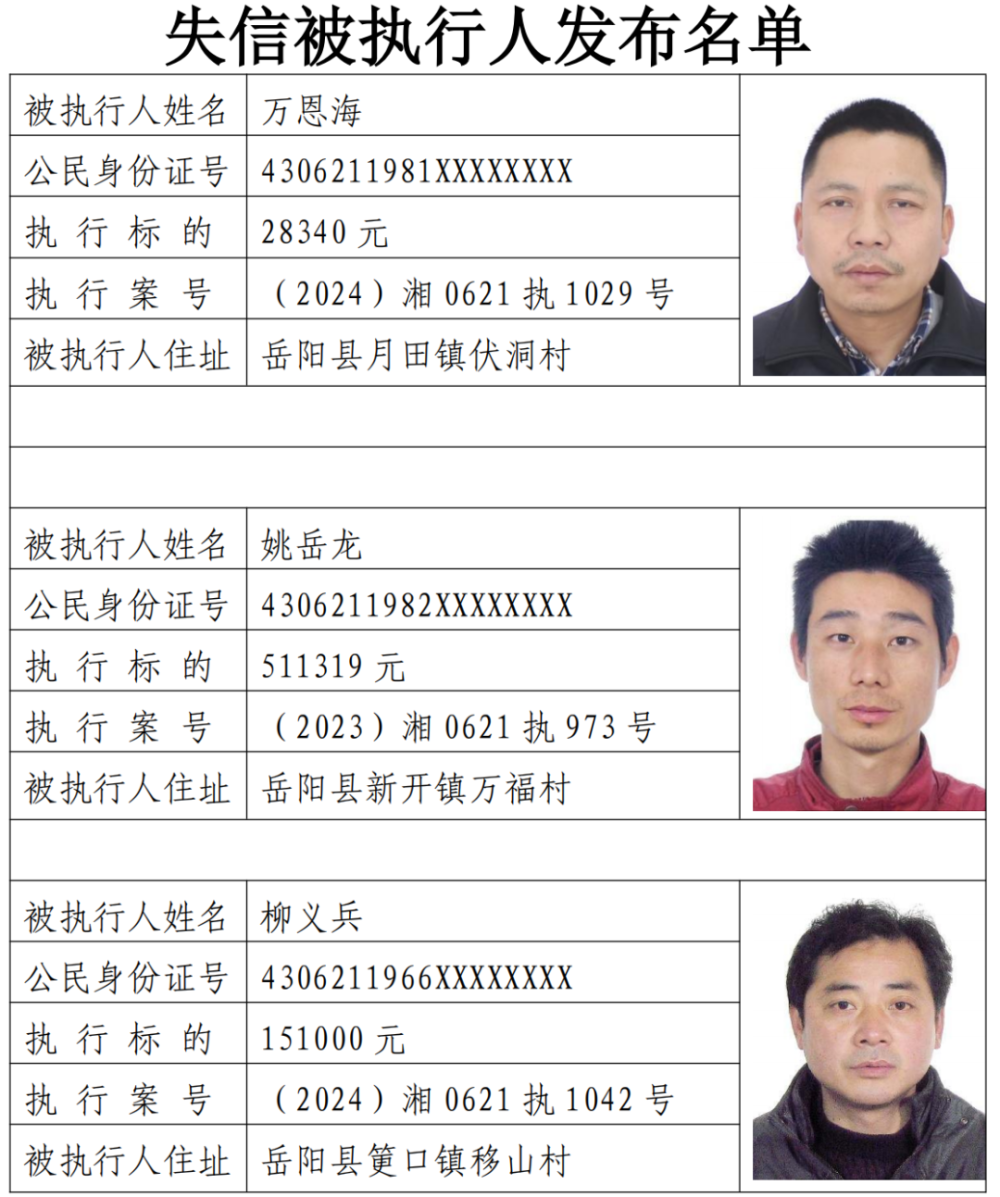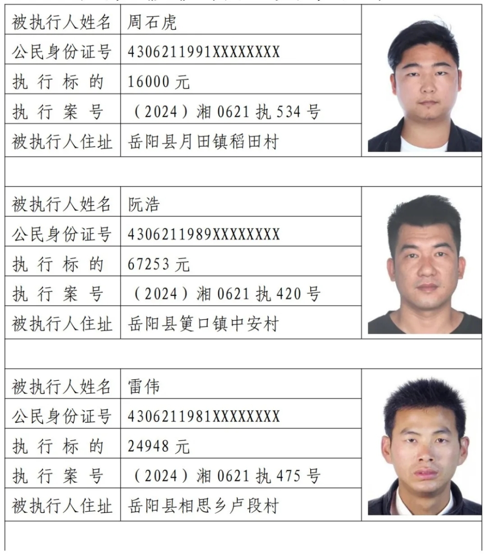 為敦促被執(zhí)行人自覺履行生效法律文書確定的義務(wù),努力推進(jìn)社會誠信建設(shè)。根據(jù)《中華人民共和國民事訴訟法》《最高人民法院關(guān)于公布失信被執(zhí)行人名單信息的若干規(guī)定》等相關(guān)法律和規(guī)定,本院決定對下列失信被執(zhí)行人信息予以曝光。曝光人員應(yīng)立即履行生效法律文書確定的義務(wù),否則將視情節(jié)采取罰款、拘留等強(qiáng)制措施,對拒不履行、抗拒執(zhí)行、規(guī)避執(zhí)行的被執(zhí)行人將依法追究刑事責(zé)任。【備注:下述失信被執(zhí)行人名單信息僅代表本次曝光時段情況,實時失信被執(zhí)行人信息以最高院網(wǎng)站查詢結(jié)果為準(zhǔn)。歡迎廣大人民群眾對已曝光被執(zhí)行人行蹤及財產(chǎn)線索進(jìn)行舉報。舉報電話:0730-7668833!