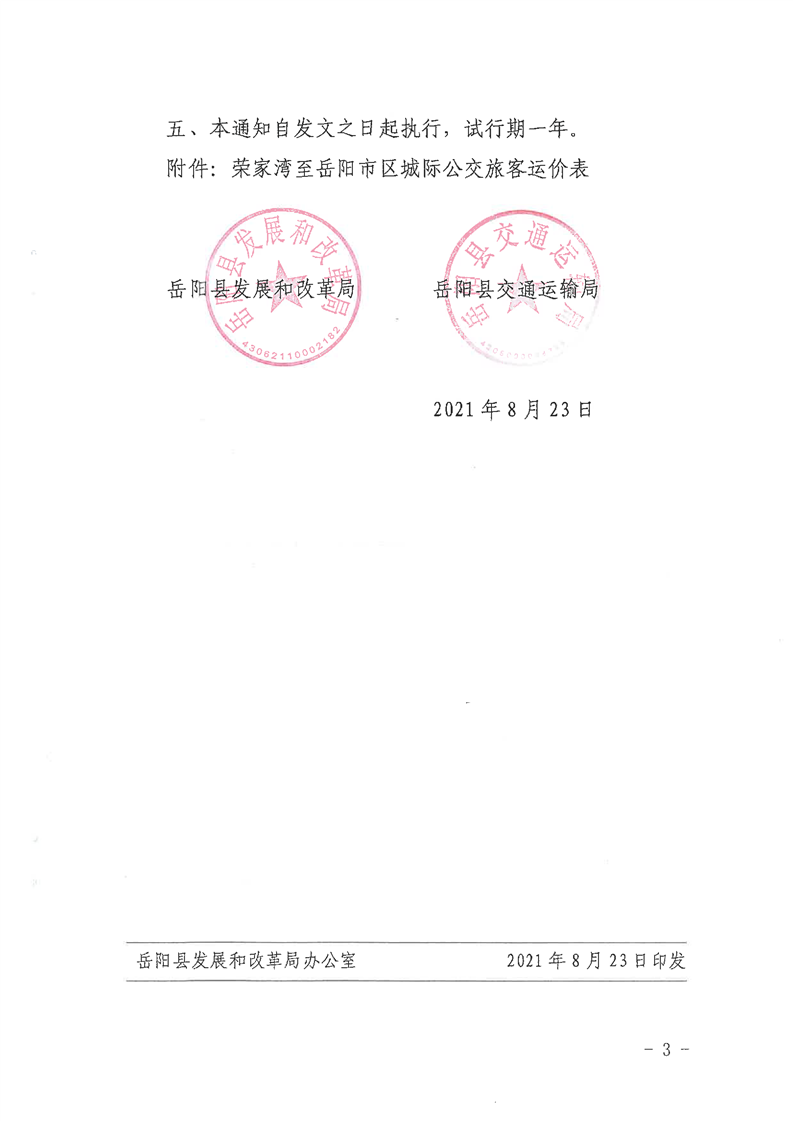 岳陽縣發(fā)展和改革局 岳陽縣交通運輸局《關于榮家灣至岳陽市區(qū)城際公交票價及有關事項的通知》