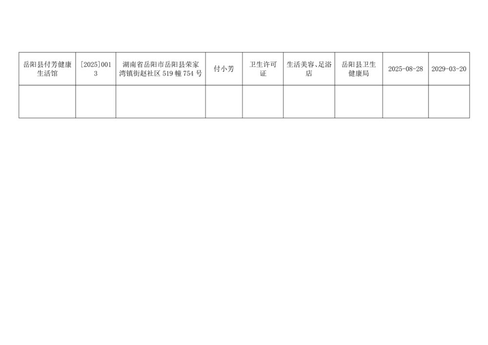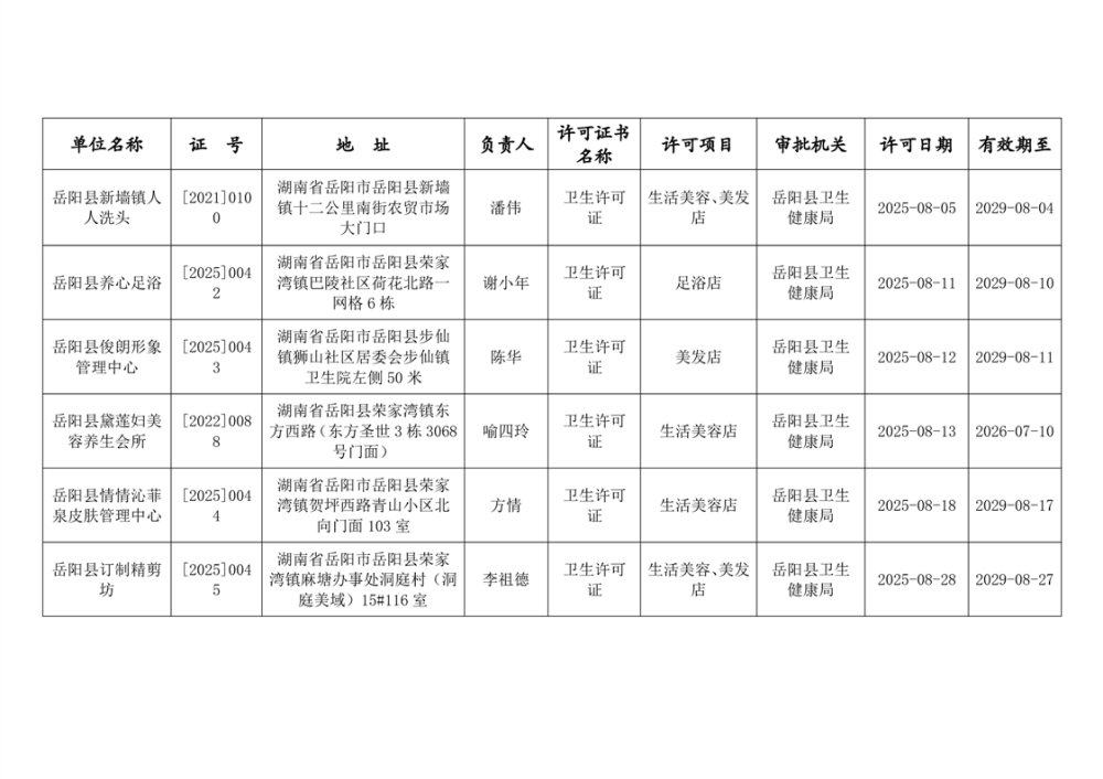 岳陽縣衛(wèi)生健康局2025年8月衛(wèi)生許可公示