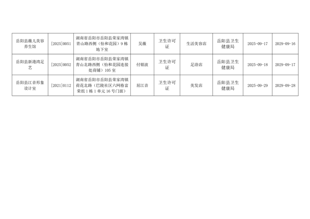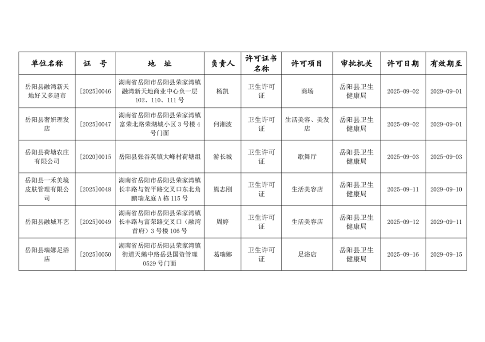 岳陽(yáng)縣衛(wèi)生健康局2025年9月衛(wèi)生許可公示