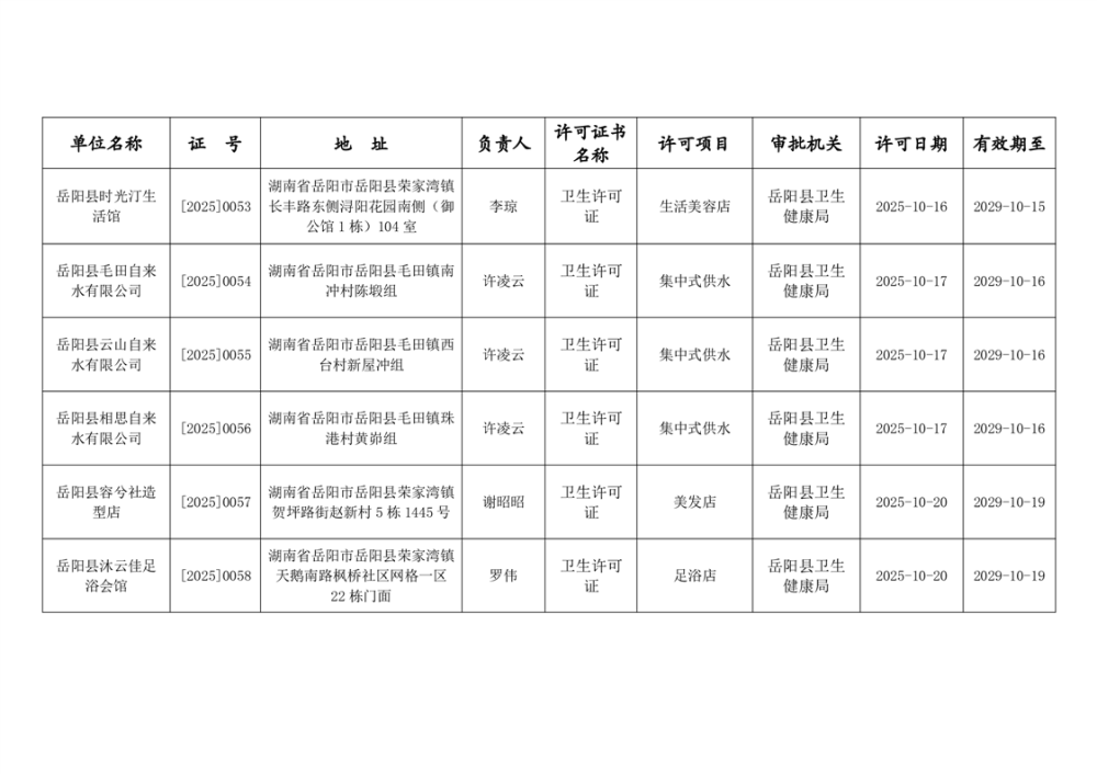 岳陽縣衛(wèi)生健康局2025年10月衛(wèi)生許可公示