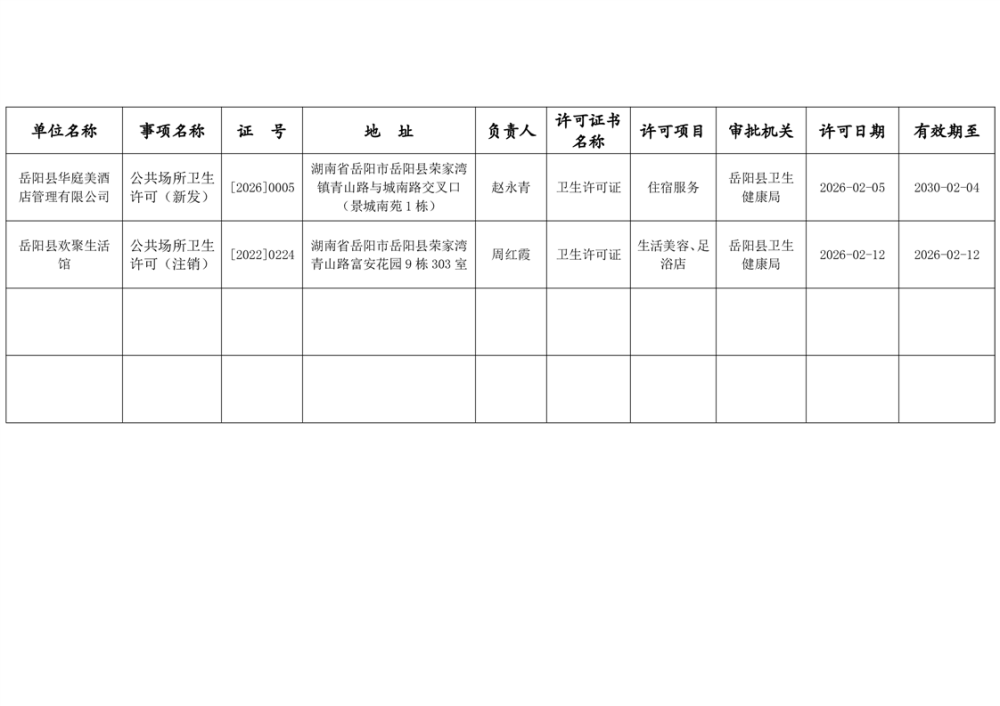 岳陽縣衛(wèi)生健康局2026年2月衛(wèi)生許可公示