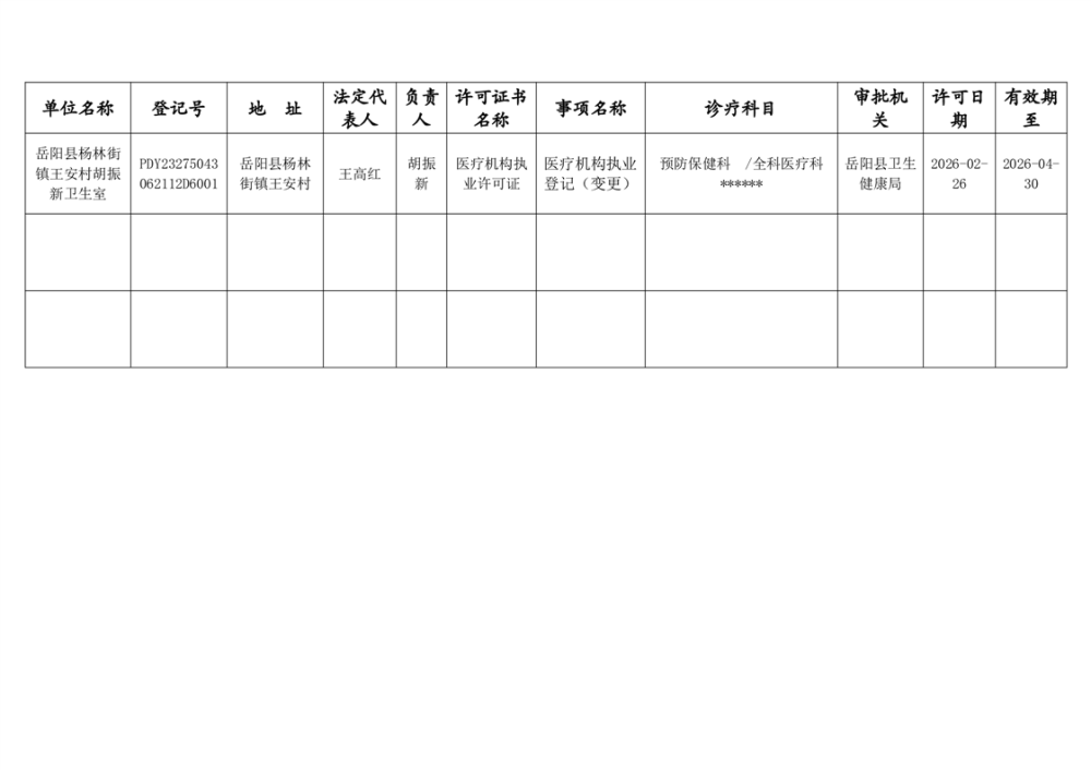 岳陽縣衛(wèi)生健康局2026年2月醫(yī)療機構(gòu)執(zhí)業(yè)許可公示