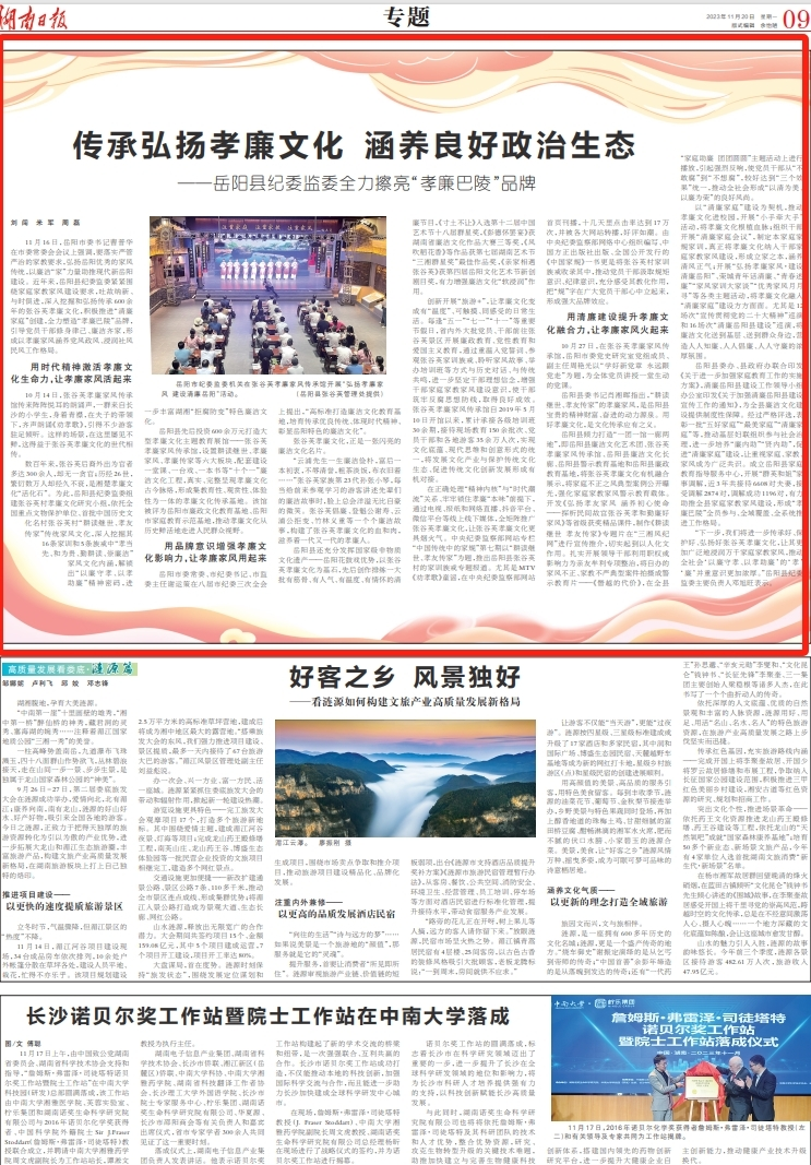 岳陽縣先后投資600余萬元打造大型孝廉文化主題教育展館——張谷英孝廉家風(fēng)傳承館,設(shè)置耕讀繼世、孝廉家風(fēng)、孝廉傳家等六大板塊,配套建設(shè)一堂課、一臺戲、一本書等“十個(gè)一”廉潔文化工程,真實(shí)、完整呈現(xiàn)孝廉文化古今脈絡(luò),形成集教育性、觀賞性、體驗(yàn)性為一體的孝廉文化傳承基地。該館被評為岳陽市廉政文化教育基地、岳陽市家庭教育示范基地,推動孝廉文化從歷史鮮活地走進(jìn)人民群眾視野。