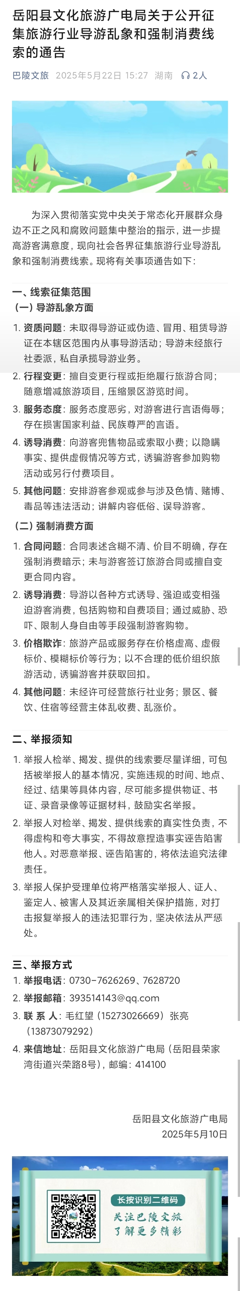 岳陽縣文化旅游廣電局關于公開征集旅游行業(yè)導游亂象和強制消費線索的通告