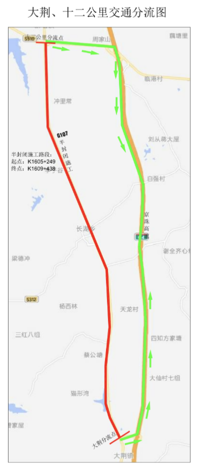 3、管制路段:岳陽(yáng)縣長(zhǎng)湖鄉(xiāng)范家村至宏圖村路段(G107岳陽(yáng)縣K1605+249-K1609+438)。