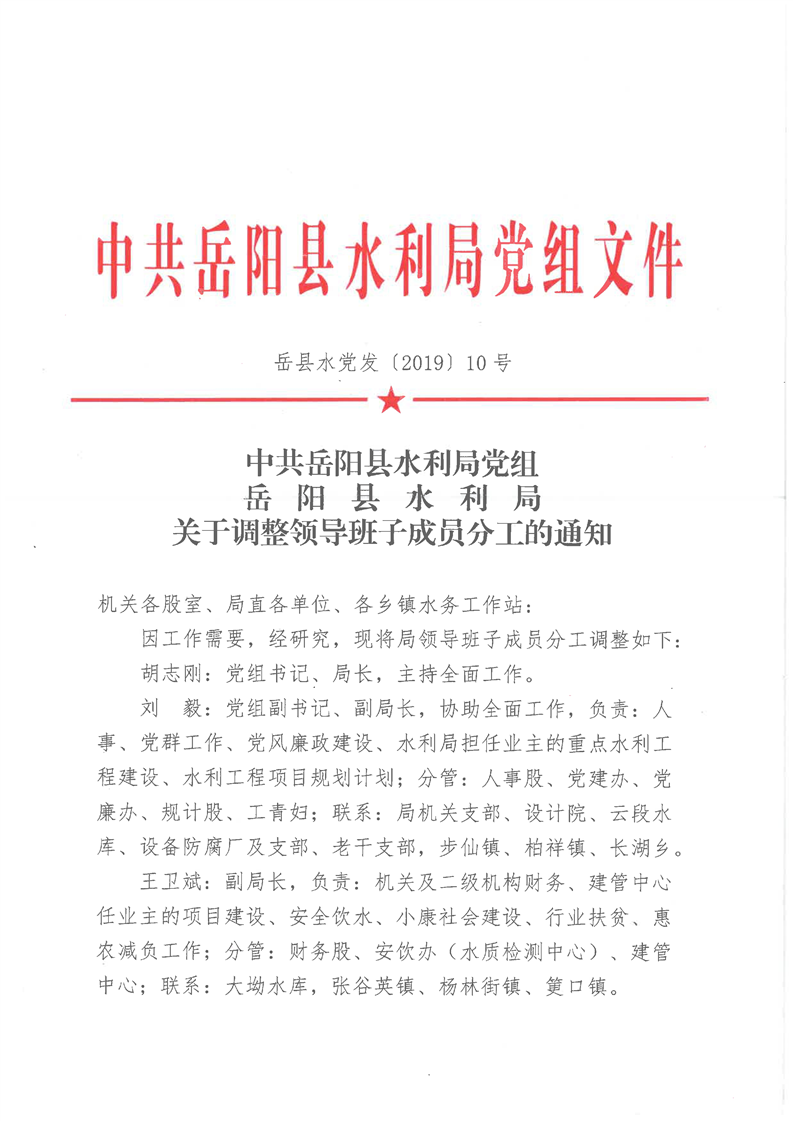 岳陽縣水利局關(guān)于調(diào)整領(lǐng)導(dǎo)班子成員分工的通知