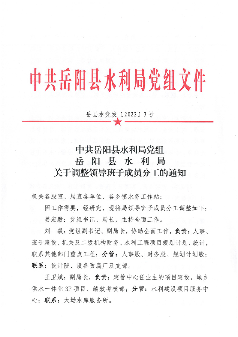 岳陽縣水利局關(guān)于調(diào)整領(lǐng)導(dǎo)班子成員分工的通知