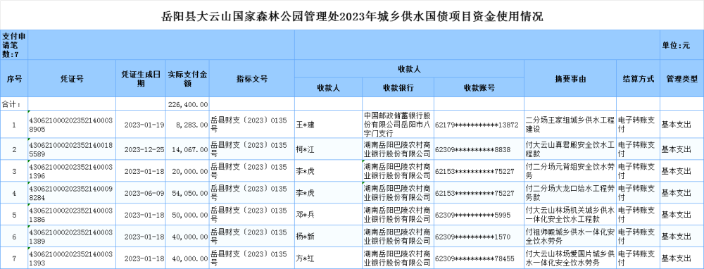 岳陽(yáng)縣大云山國(guó)家森林公園管理處2023年城鄉(xiāng)供水國(guó)債項(xiàng)目資金使用情況