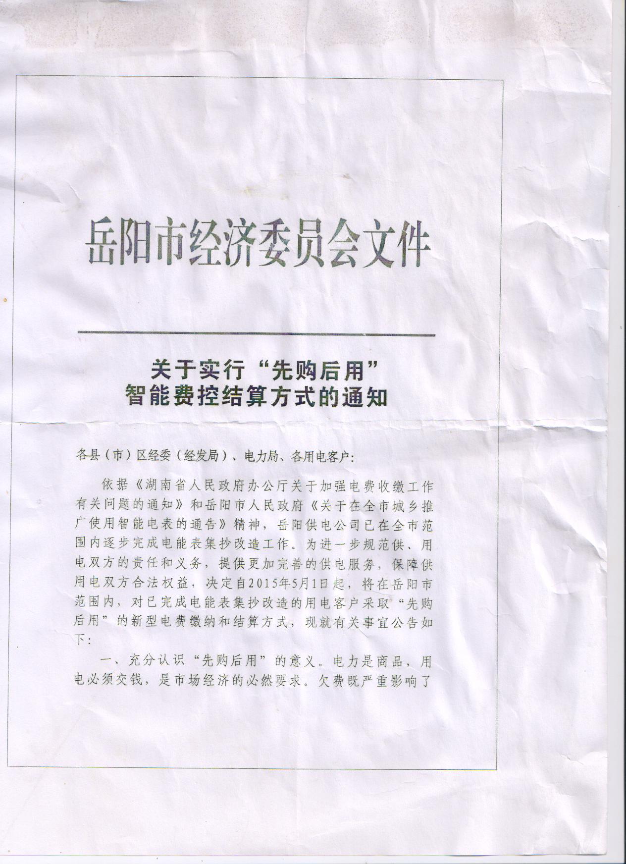 岳陽市經(jīng)濟委員會實行“先購后用”智能費控結(jié)算方式的通知