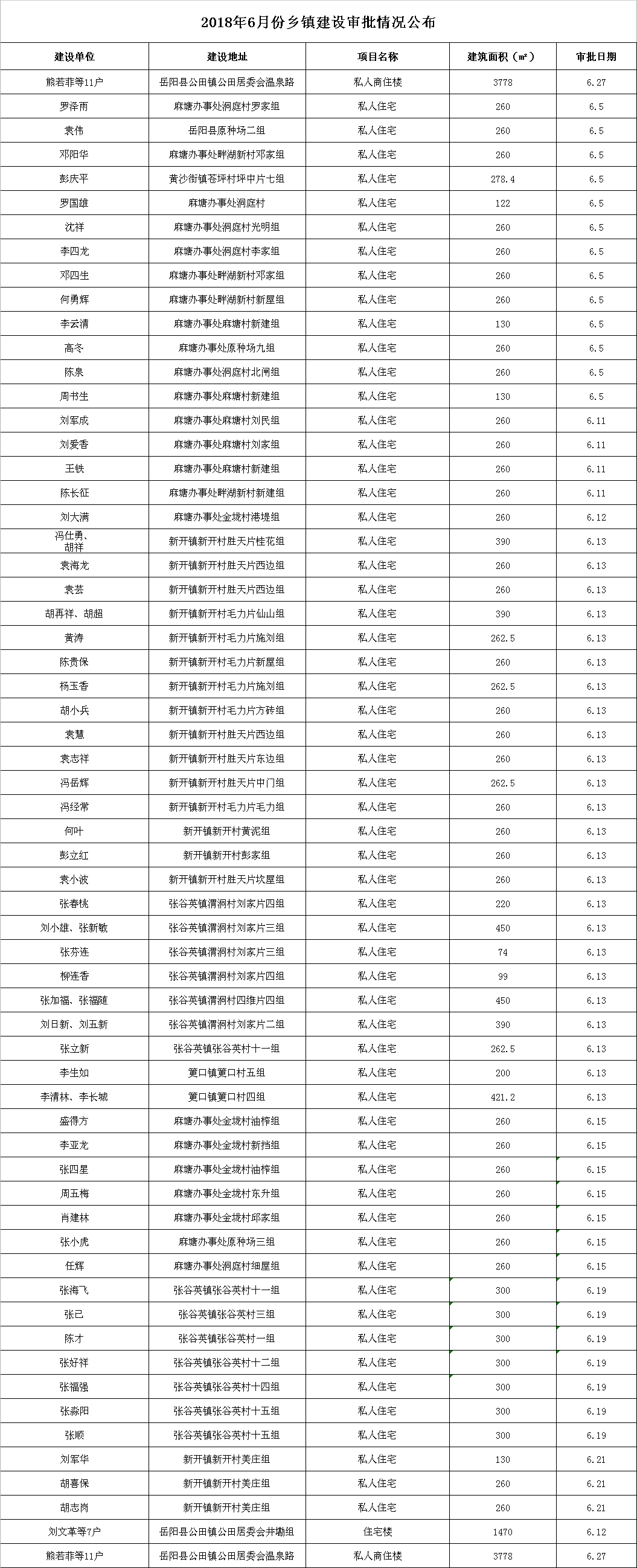 2018年6月份鄉(xiāng)鎮(zhèn)建設(shè)審批情況公布