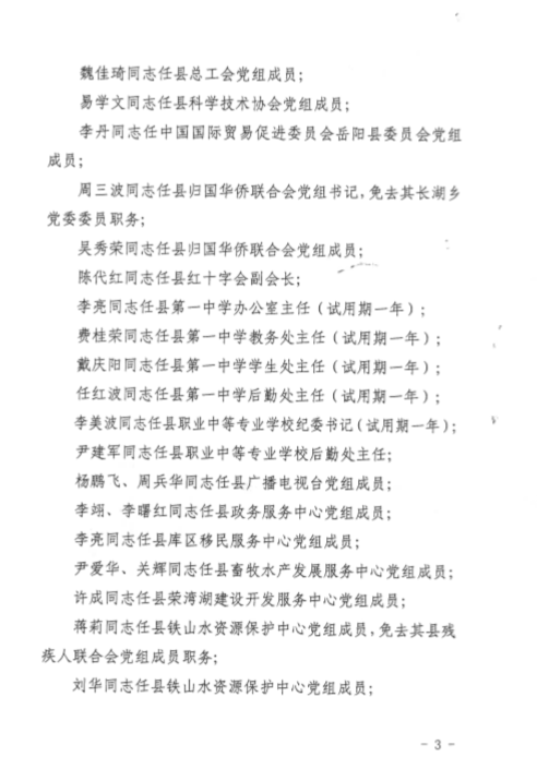 關于岳陽縣委縣政府對住建局班子成員任免的通知