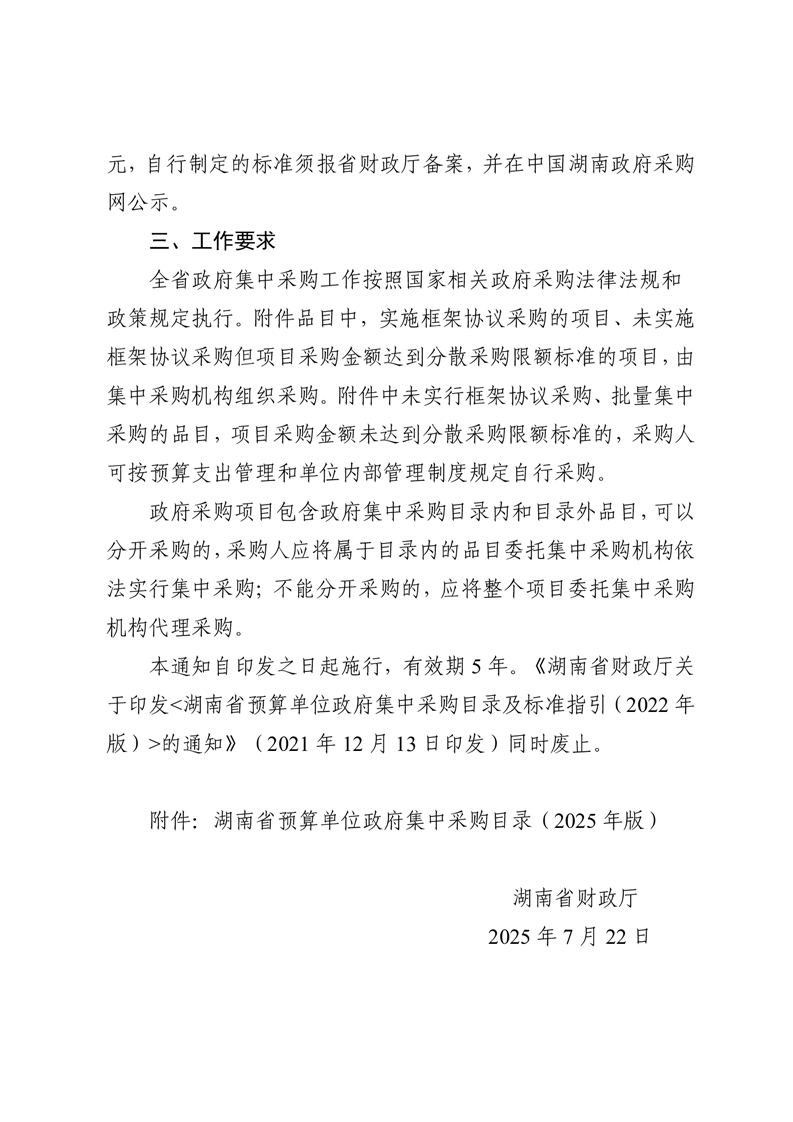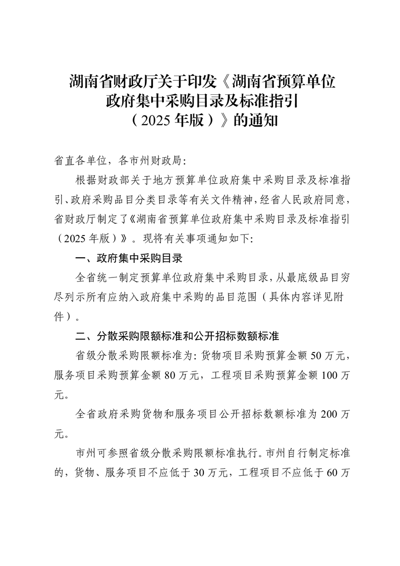 湖南省財(cái)政廳關(guān)于印發(fā)《湖南省預(yù)算單位政府集中采購(gòu)目錄及標(biāo)準(zhǔn)指引(2025年版)》的通知(湘財(cái)購(gòu)〔2025〕29號(hào))