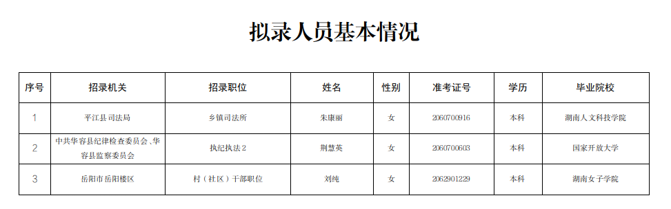 根據(jù)《湖南省2022年考試錄用公務(wù)員公告》及有關(guān)規(guī)定,經(jīng)報名、筆試、資格審查、面試、體檢、考察等程序,確定朱康麗、荊慧英、劉純3名同志(因懷孕延期體檢,產(chǎn)后體檢合格)為2022年度擬錄用公務(wù)員,現(xiàn)予以公示。