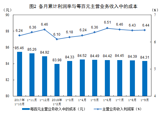 1-9月份,規(guī)模以上工業(yè)企業(yè)實(shí)現(xiàn)主營(yíng)業(yè)務(wù)收入77.1萬(wàn)億元,同比增長(zhǎng)9.4%;發(fā)生主營(yíng)業(yè)務(wù)成本65萬(wàn)億元,增長(zhǎng)9.1%;主營(yíng)業(yè)務(wù)收入利潤(rùn)率為6.44%,同比提高0.29個(gè)百分點(diǎn)。