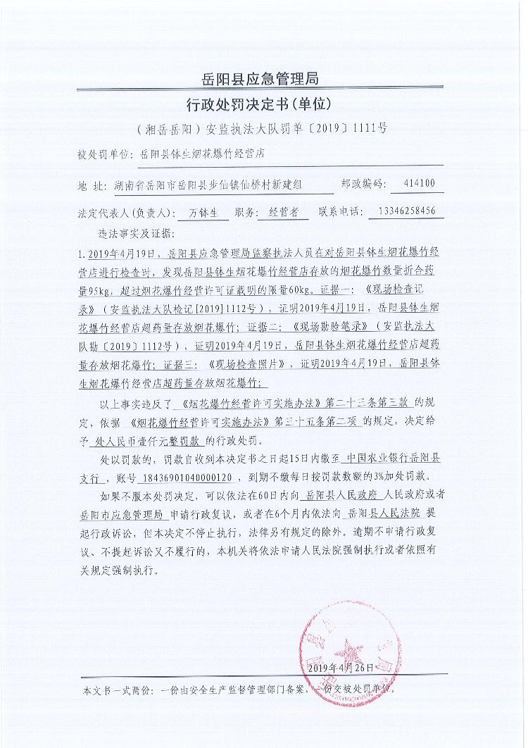 行政處罰決定書(湘岳岳陽安監(jiān)執(zhí)法大隊罰單〔2019 〕1111號)