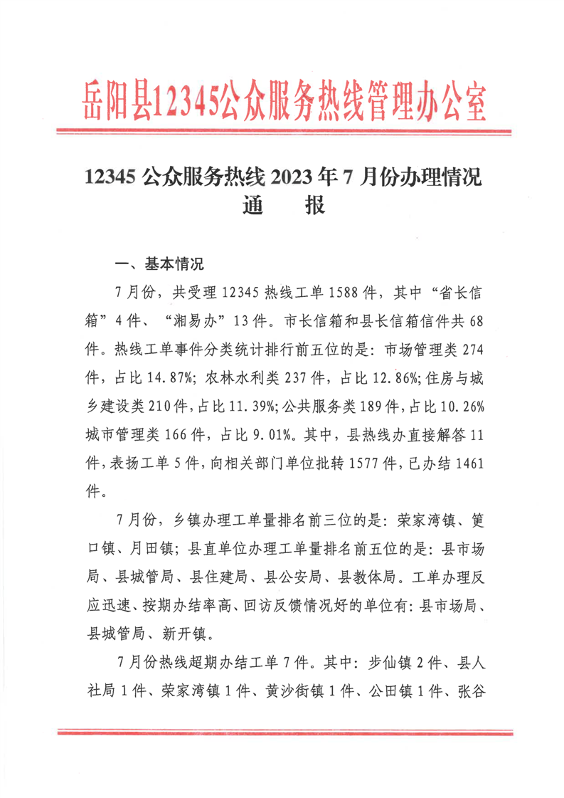 岳陽縣12345公眾服務(wù)熱線2023年7月份辦理情況通報
