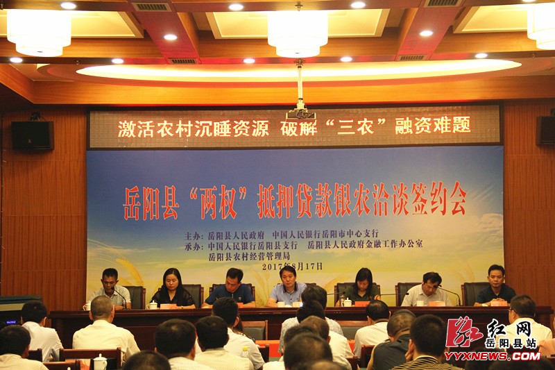 紅網(wǎng)岳陽縣分站8-18訊(記者 李雨桑)8-17,我縣召開“兩權(quán)”抵押貸款銀農(nóng)洽談簽約會,縣委常委、常務(wù)副縣長吳光文出席并講話。市人民銀行副行長蘭紅梅,縣委宣傳部、縣財政局、人民銀行岳陽縣支行、在縣銀行金融機(jī)構(gòu)、土地經(jīng)營權(quán)流轉(zhuǎn)企業(yè)(個人)及各鄉(xiāng)、鎮(zhèn)、辦事處負(fù)責(zé)人參加簽約儀式。