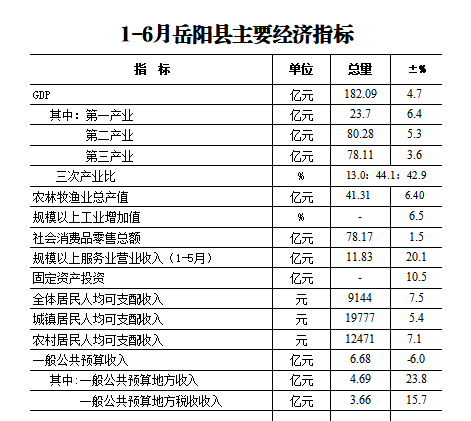 2022年1-6月岳陽縣主要經(jīng)濟指標