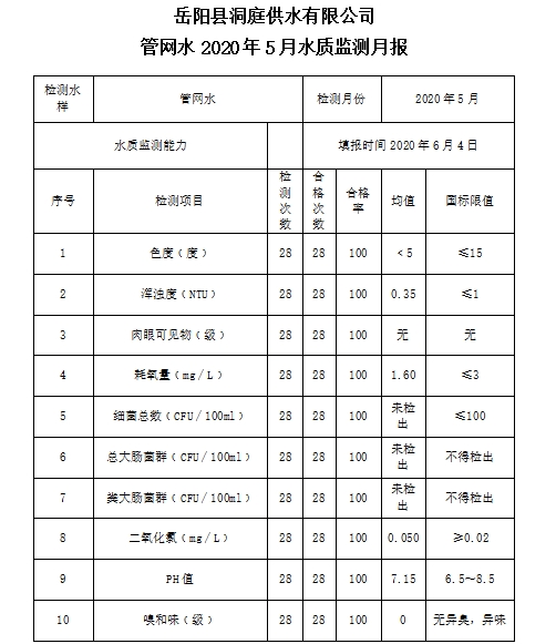 岳陽縣洞庭供水有限公司關(guān)于2020年5月份的水源水、管網(wǎng)水、一水廠二水廠出廠水水質(zhì)監(jiān)測報(bào)表