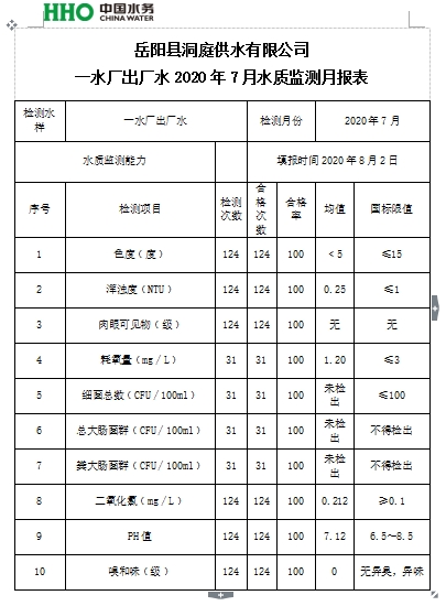 岳陽(yáng)縣洞庭供水有限公司 管網(wǎng)水2020年7月水質(zhì)監(jiān)測(cè)月報(bào) |