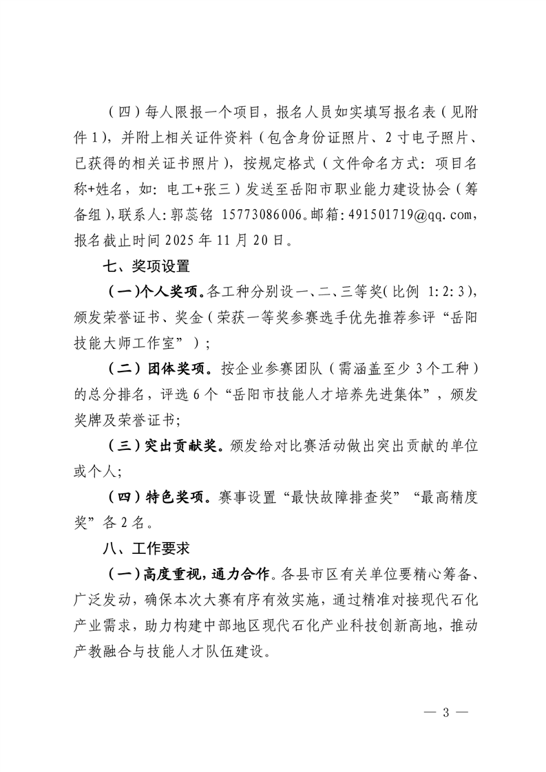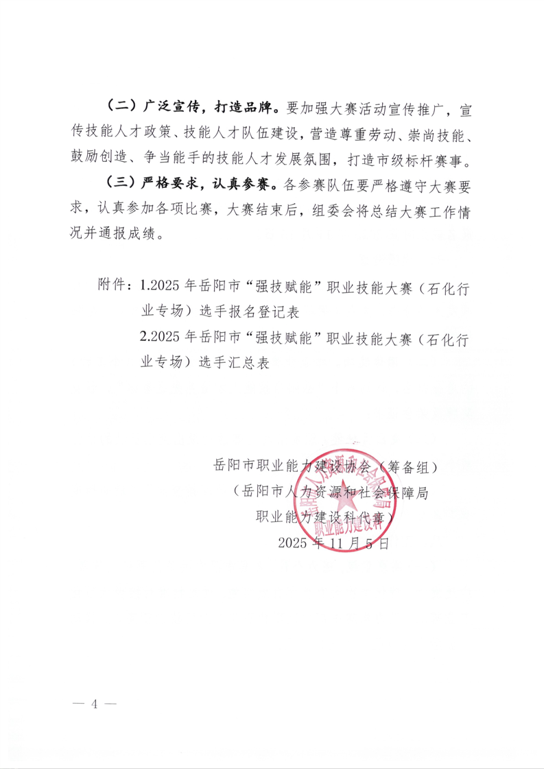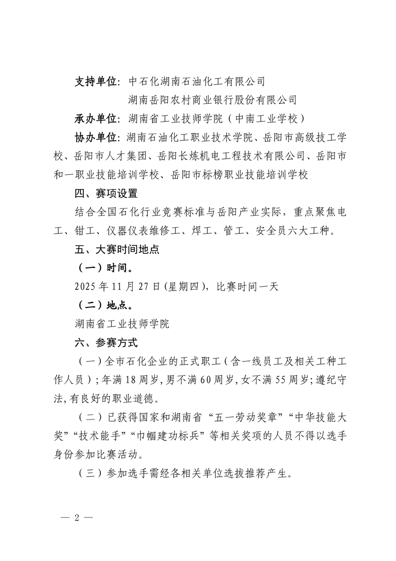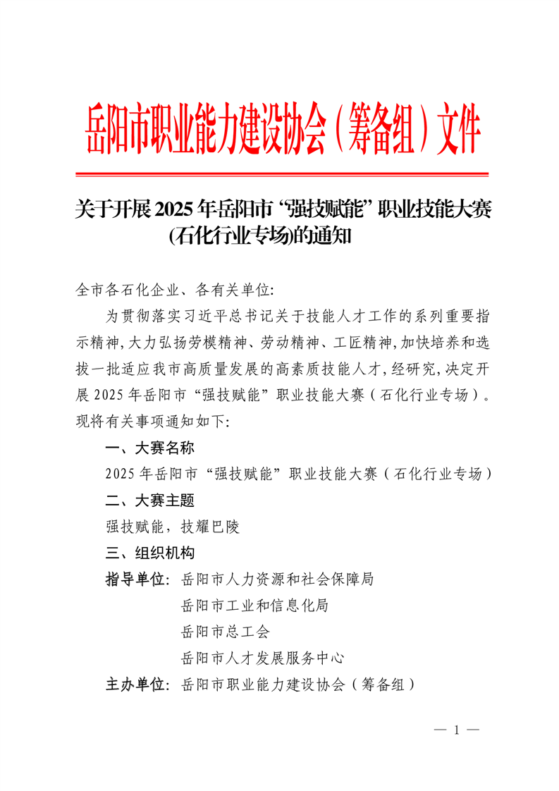 關(guān)于開展2025年岳陽(yáng)市“強(qiáng)技賦能”職業(yè)技能大賽(石化行業(yè)專場(chǎng))的通知